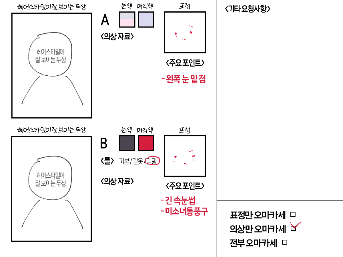 이미지 안에 반드시 포함되어야 할 것: A/B 위치 표기, 의상 자료